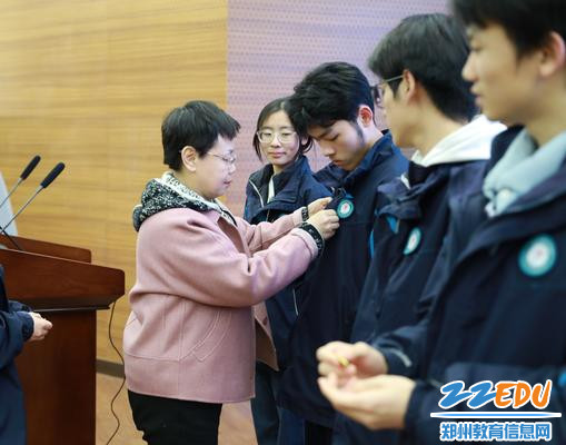 郑州市第十二中学党委书记陈立新为新团员代表佩戴团徽徽章