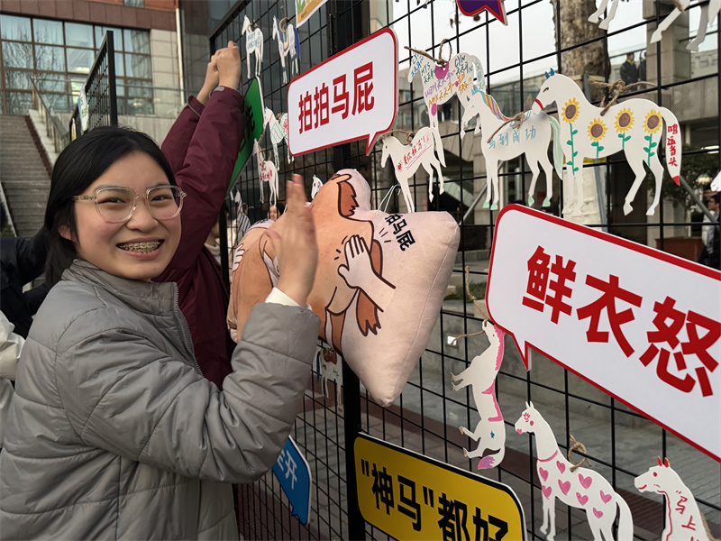 与之呼应的右侧“2026,请多指教”祝福互动区,则充满了欢快的节奏与明亮的色彩。架上不仅悬挂着“马到成功”“一马当先”等寓意美好的成语卡片,更缀满了学生手绘的各式“小马”心愿卡。同学们举着自己绘制的“勇气马”“乐观马”,在打卡墙前合影,笑声朗朗:“我要把这张‘前行不辍’送给明天的自己!”