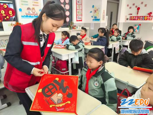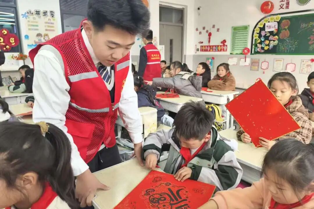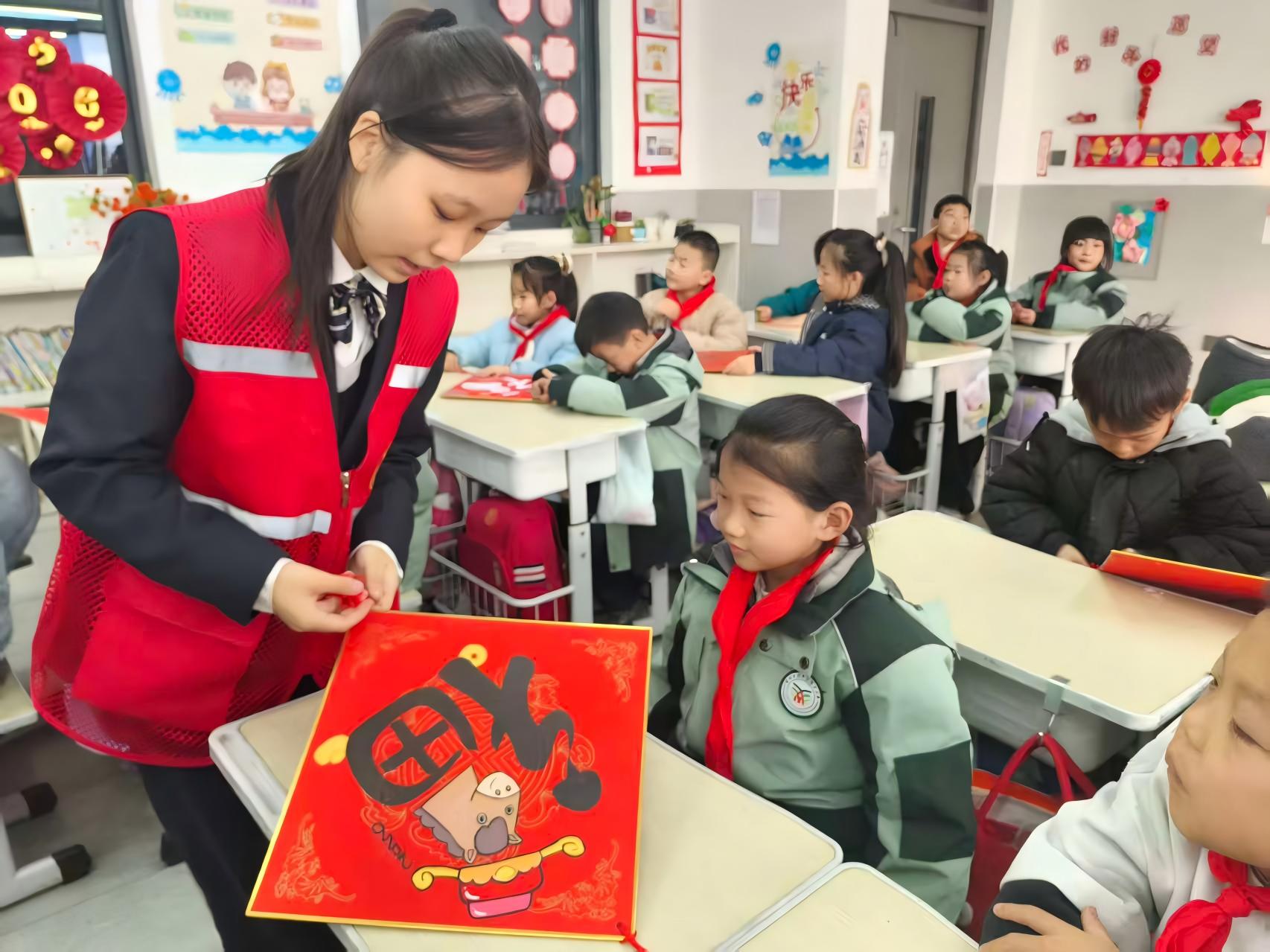 随后,经开六中的团员们与育才小学二年级少先队员们进行了梦幻联动,在交流中,经开六中朱辛瑶以胸前闪闪发光的团徽向育才小学二年级少先队员介绍了自己的理想信念,为小小的他们树立了榜样。党员教师姚梦云老师用亲切生动的语言,向队员们分享了自己作为党员教师的责任和荣耀。她鼓励孩子们从小事做起、帮助同学、尊敬师长,在劳动与奉献中培养乐于助人的好习惯。最后,经开六中的团员们将自己和同学们亲手绘制的新年福字赠送给育才小学二年级的同学们,一张张红彤彤的福字承载着新年的美好祝福,墨香里传递着伙伴间的真挚情谊,孩子们接过福字时的笑容,成为活动中最动人的画面。
