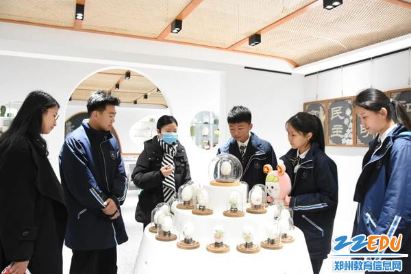 在郑州经济技术开发区育才小学宋瑶瑶老师的带领下,经开六中的师生共同参观了育才小学“蛋”生美好艺术展馆,这是一个神奇的展馆,展馆里的趣味展品与创意布置让孩子们大开眼界,有平面主题的蛋壳贴画,有立体蛋雕做成的漂亮的灯饰,还有学生创作的“二十四节气蛋壳画”系列,以环保理念与艺术美感的结合,致敬传统工艺。大家一边参观一边交流,在好奇的提问与细致地讲解中,不仅拓宽了视野,更拉近了彼此的距离。