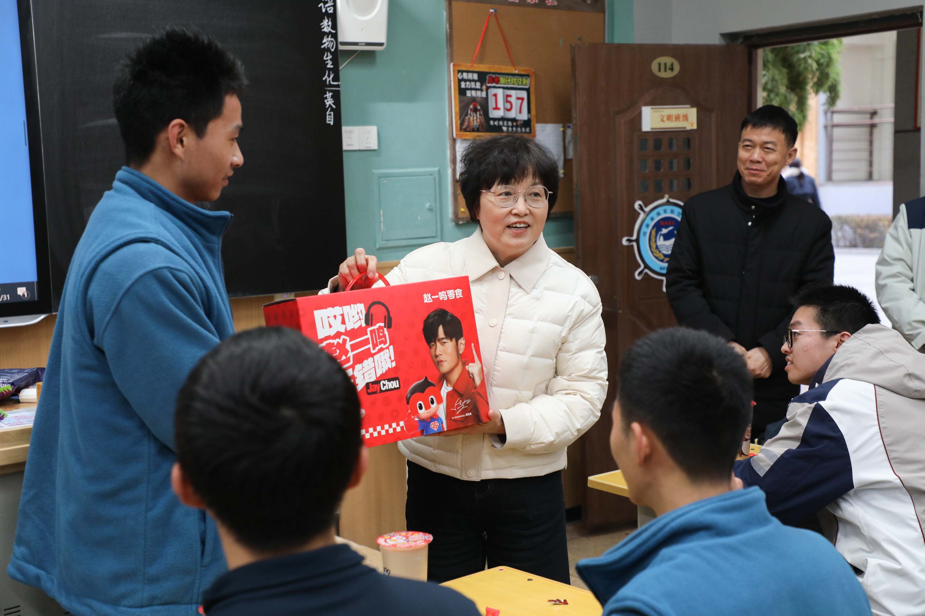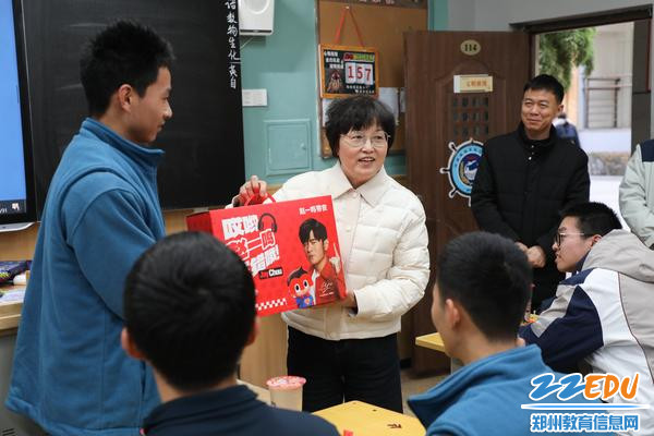 郑州市第九中学党委书记周继莉携校领导班子走进各班教室,送上寓意“一鸣惊人”的零食礼包,寄托着学校对学子们新一年学业进步、前程似锦的殷切期盼。将浓浓的新年祝福传递给每一位学子。