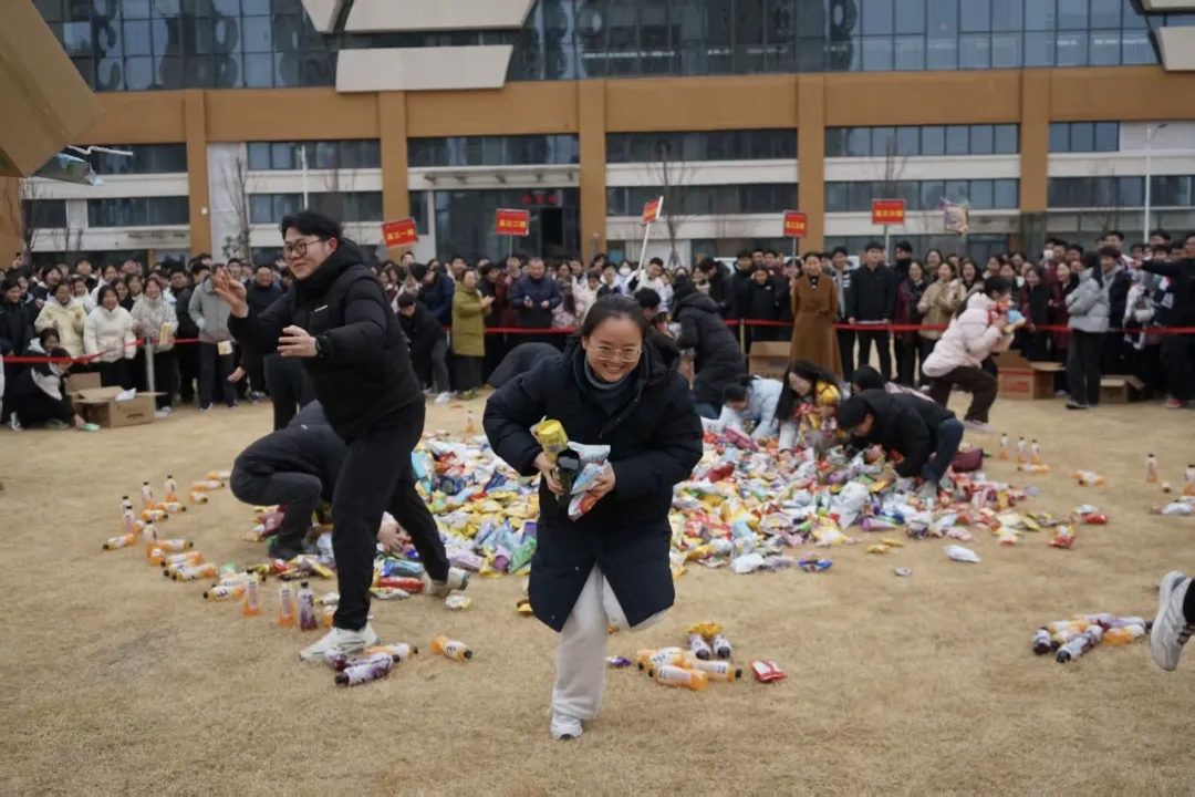 “老师加油!老师冲呀!”同学们的呐喊声震耳欲聋,班主任们也使出浑身解数,有的健步如飞,有的默契配合,现场秒变欢乐海洋。活动结束后,抢到的零食将作为班级共享的“新年礼物”,由班主任与学生们共同分享,传递节日的甜蜜与温暖。