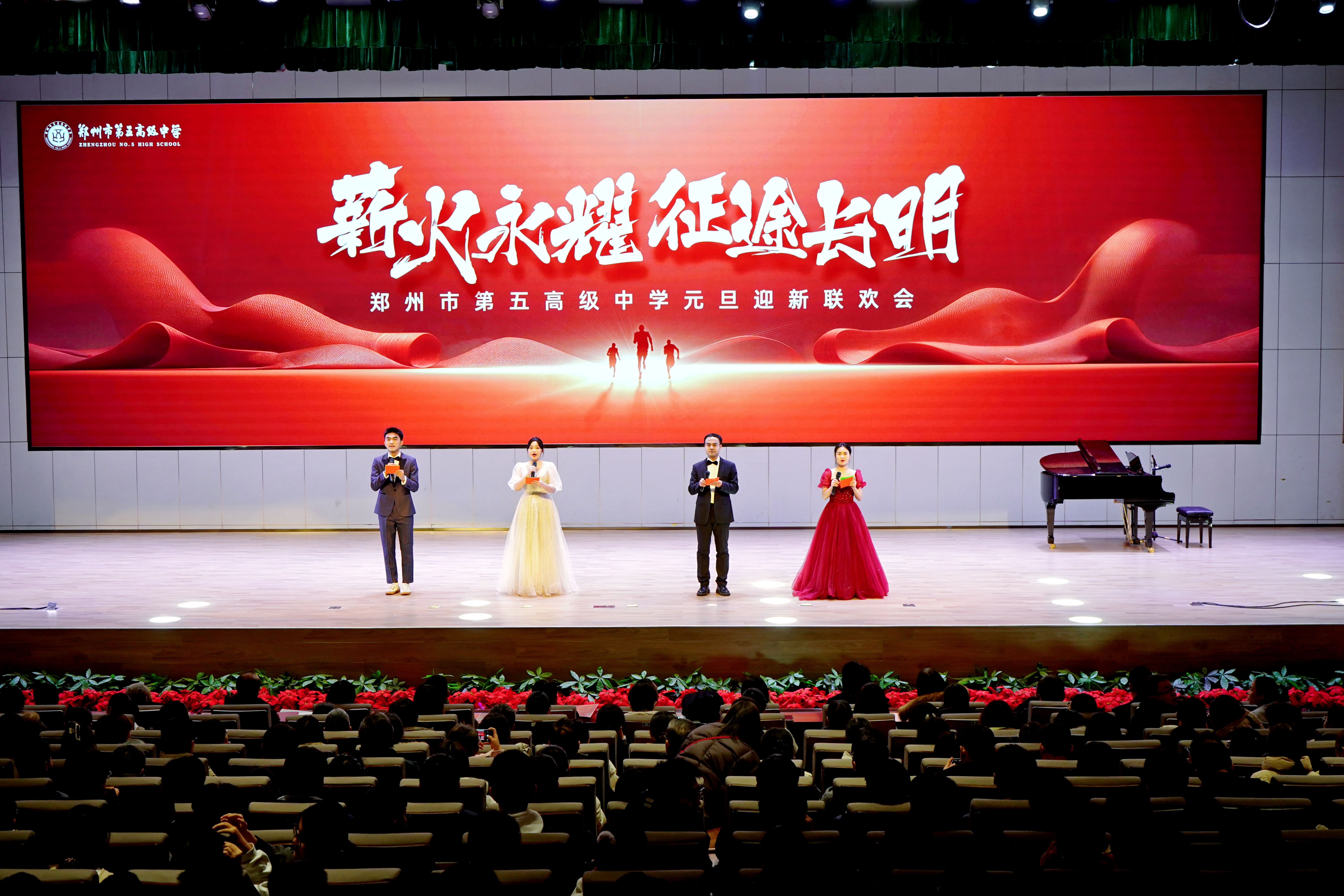 辞旧迎新启华章,师生同乐庆元旦。2025年12月31日下午,郑州市第五高级中学明珠艺术中心举行2026年元旦迎新联欢会。学校千余名师生、家长代表共赏文艺盛宴,共话美好未来。