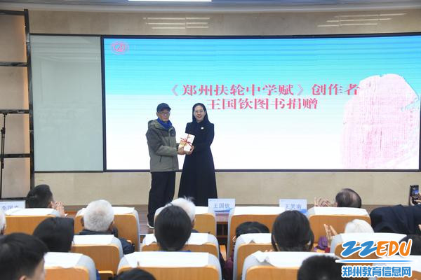 随后,校友代表王笑南致辞,深情回望求学岁月,分享对母校的牵挂与期许,其助力校园文化建设的赤诚之心令人动容。王国钦则分享了赋文创作心路,解读了作品承载的校史荣光与精神内核,并向学校捐赠图书,为校园文化添砖加瓦。紧接着,学生代表声情并茂地朗诵《郑州扶轮中学赋》,铿锵诵读中传递着对学校文化的崇敬与传承之志。