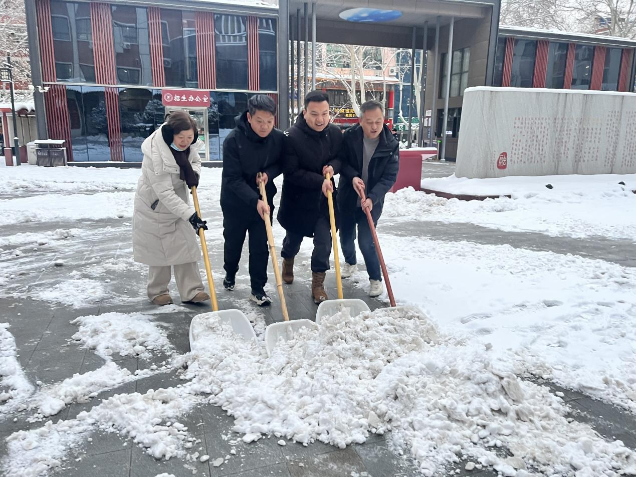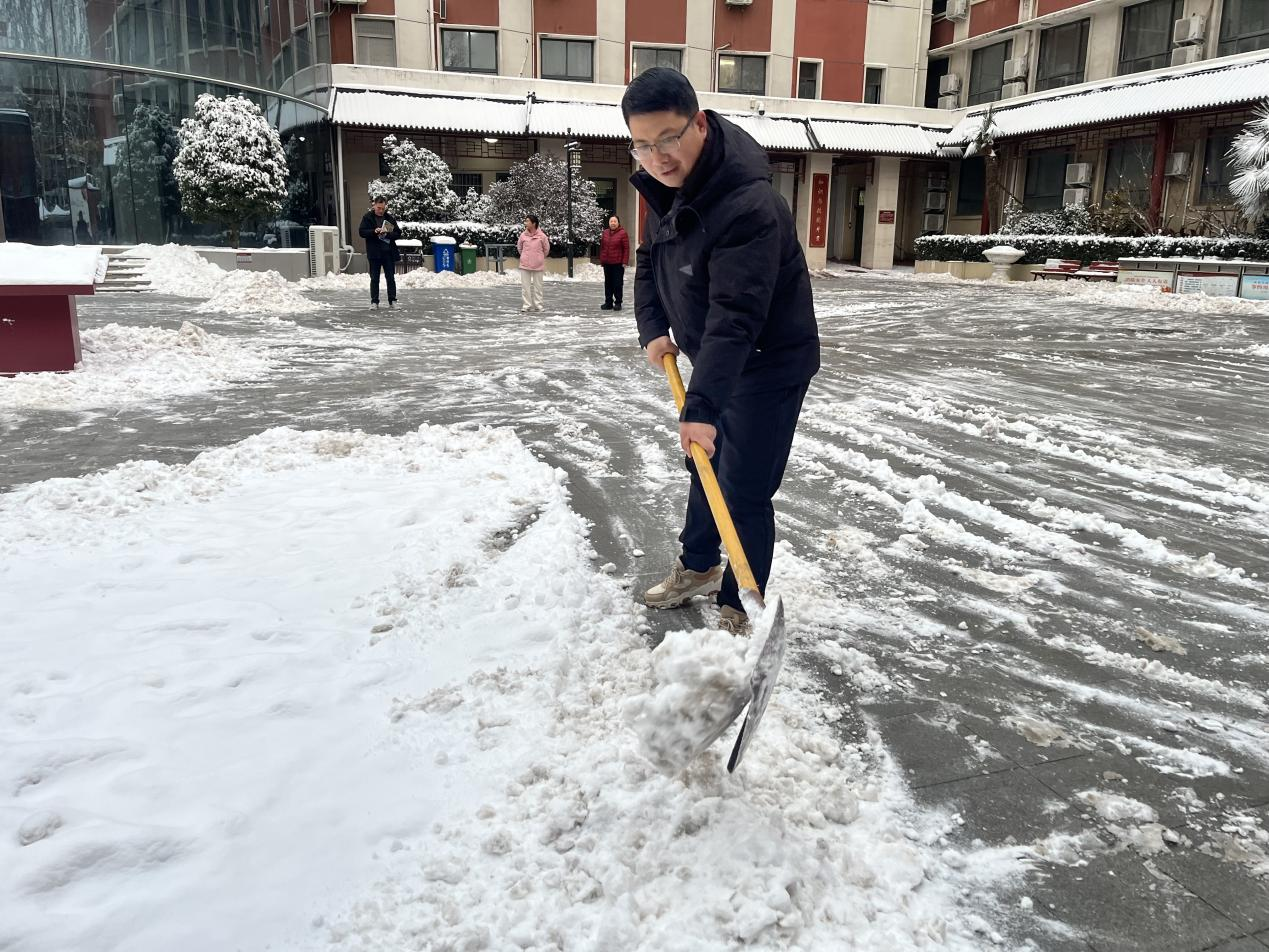 郑州市金融学校校长操瑞洪带头铲雪