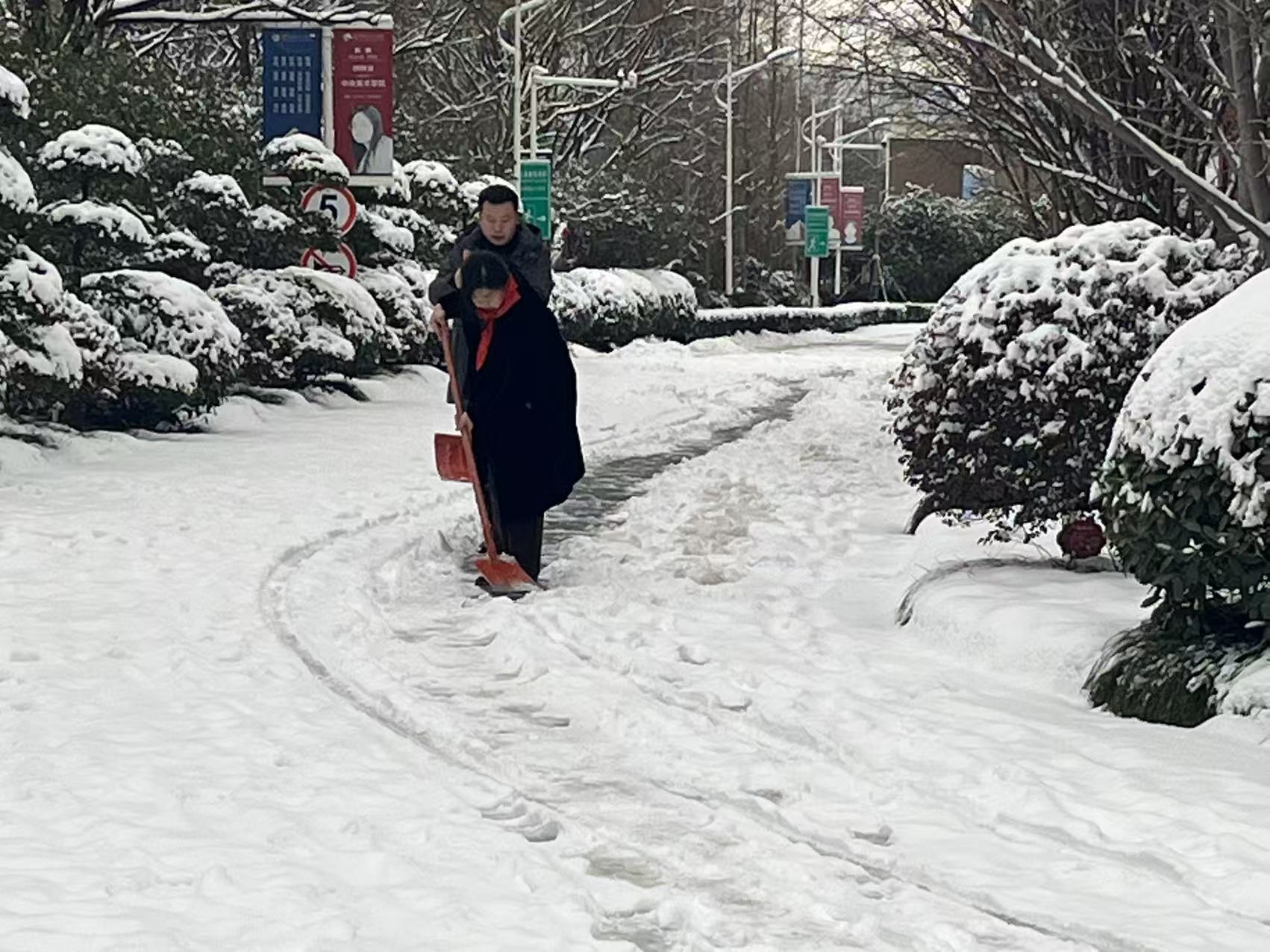 学校总务处积极协调,保证铲雪锨的充足。在学校领导的带领下,三保人员、行政人员齐心协力,干得热火朝天。只见大家手持铁锹、扫帚等工具,自发组成“铲雪突击队”,分工协作、默契配合。有的挥锹破冰铲雪,铁锹与地面碰撞的铿锵声响彻校园;有的手持扫帚细致清扫,不放过任何一处湿滑路段,避免二次结冰。大家哈着白气,却丝毫没有放慢节奏。花卉维护工常师傅拿着竹竿,把校园绿化树木上的积雪敲落,防止积雪压折树木,也防止冻雪砸到人。