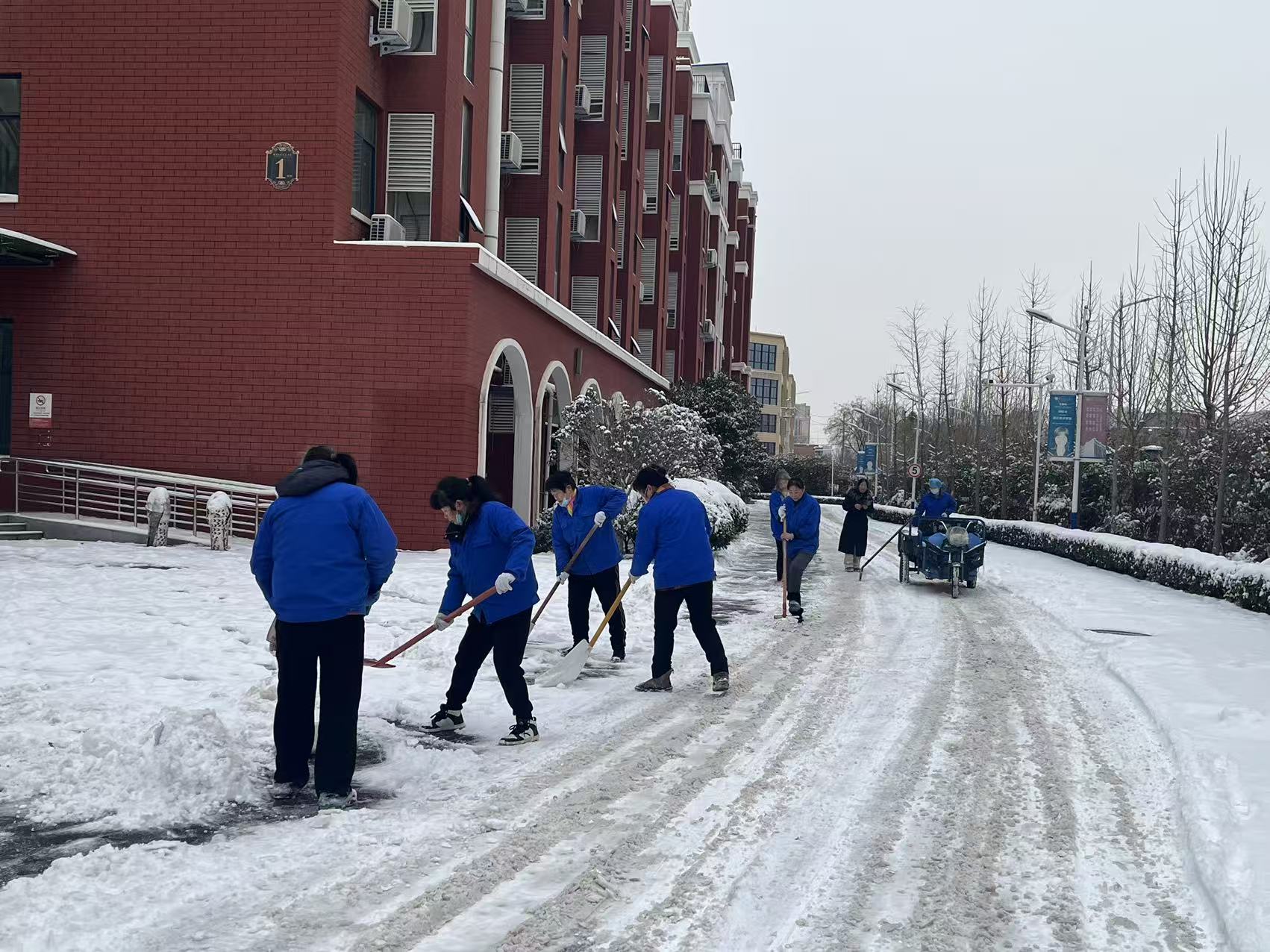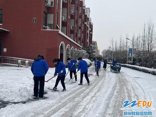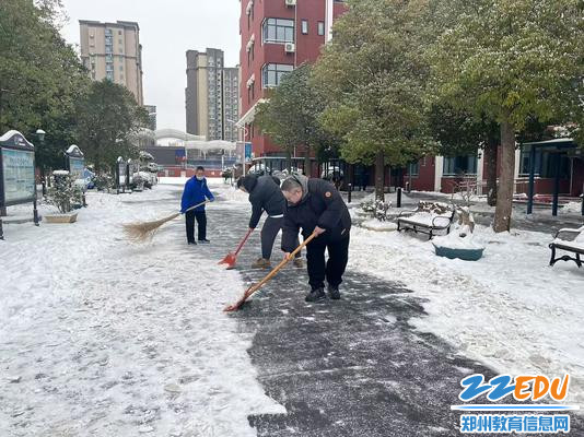 郑州市第十八中学党委书记段亚萍一行在校门外铲雪
