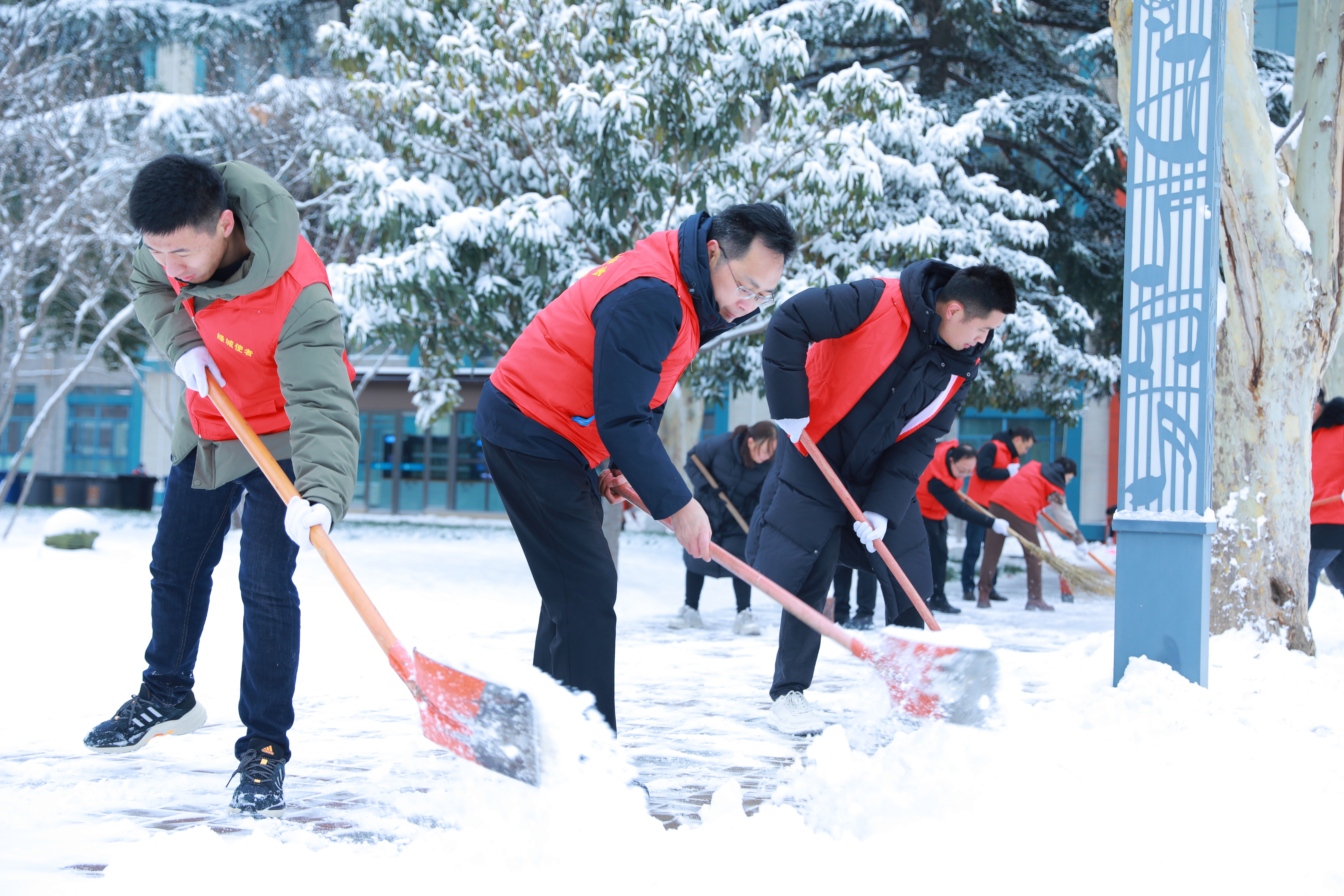 师者先行,立己为范。学校党委书记陈立新、校长周铭等领导与教职工率先冲锋,不畏凛冽寒风,手持铁锹、扫帚,身着红色志愿者马甲奔赴校园各关键点位。学校门口、主干道、教学楼前,处处是他们忙碌的身影:面对厚雪坚冰,众人合力攻坚、携手破局;分工协作、接力推进。三尺讲台之上,他们是传道授业的解惑者;皑皑白雪之中,他们是身先士卒的行动者,用弯腰铲雪的身影,为学生上了生动的一课。