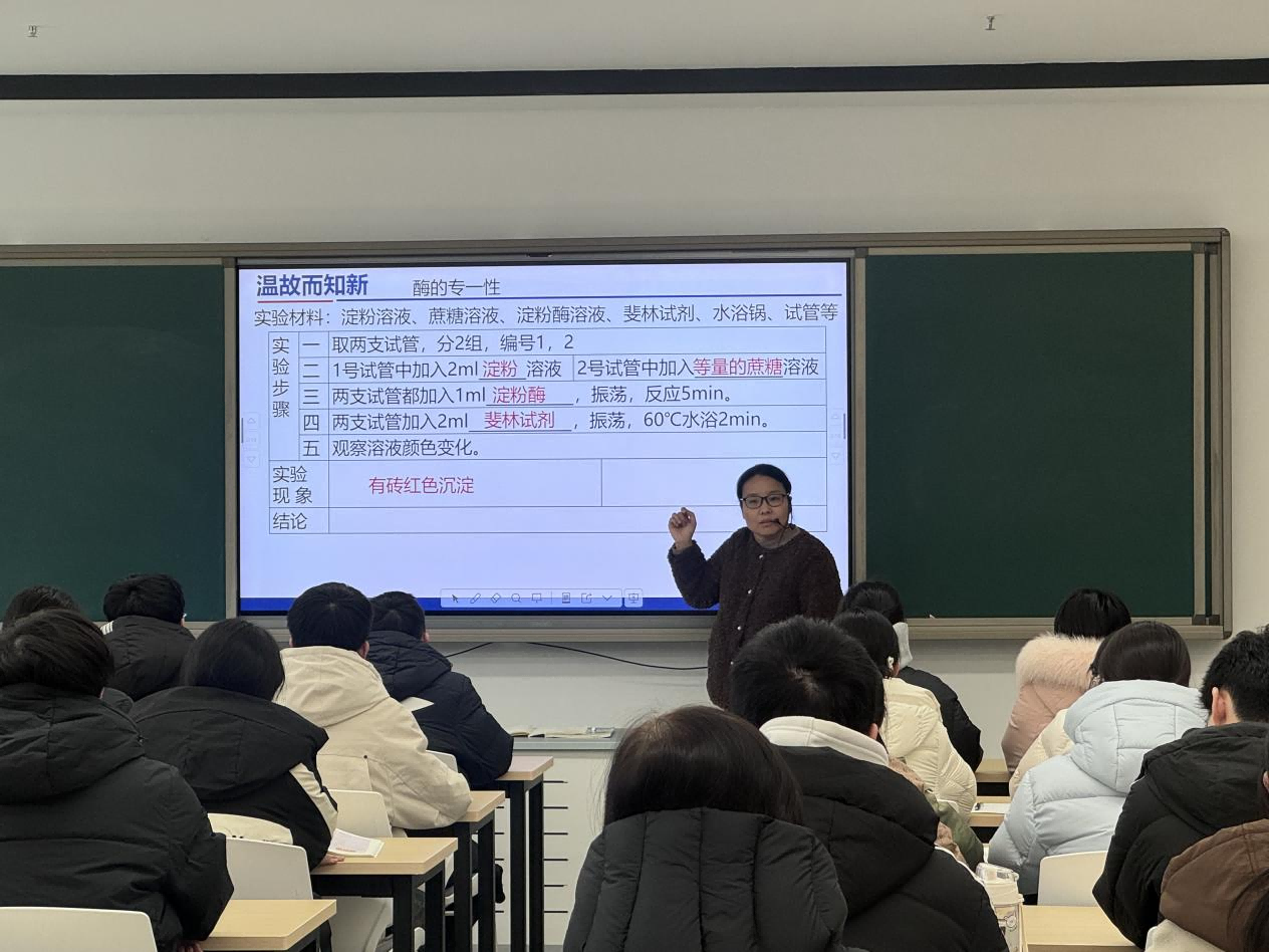 高一年级李娟老师以“生活中加酶洗衣粉的去污效果差异”为切入点导入课堂,自然引出“影响酶活性的探究实验”核心内容,让抽象的实验原理贴近日常生活,快速调动学生的探究热情。课堂严格遵循“提出问题—作出假设—设计实验—进行实验—分析结果”的科学探究流程,聚焦温度、pH值两大核心变量,引导学生自主设计对照实验、规范操作实验步骤、精准分析实验数据,全程凸显学生的主体地位。教学中注重教学评一致性,针对“实验变量控制是否严谨”“异常实验结果如何分析”等问题,鼓励学生分组讨论、充分表达观点,教师结合实验重难点逐一点拨指导,帮助学生在实操与思辨中构建科学探究思维、掌握实验核心方法。课程尾声,李娟老师引导学生结合实验结论反思生活中的酶应用场景,让实验知识服务于生活实践,实现了“学思用贯通、知信行统一”,有效提升了学生的科学探究能力、实验操作技能与科学素养。