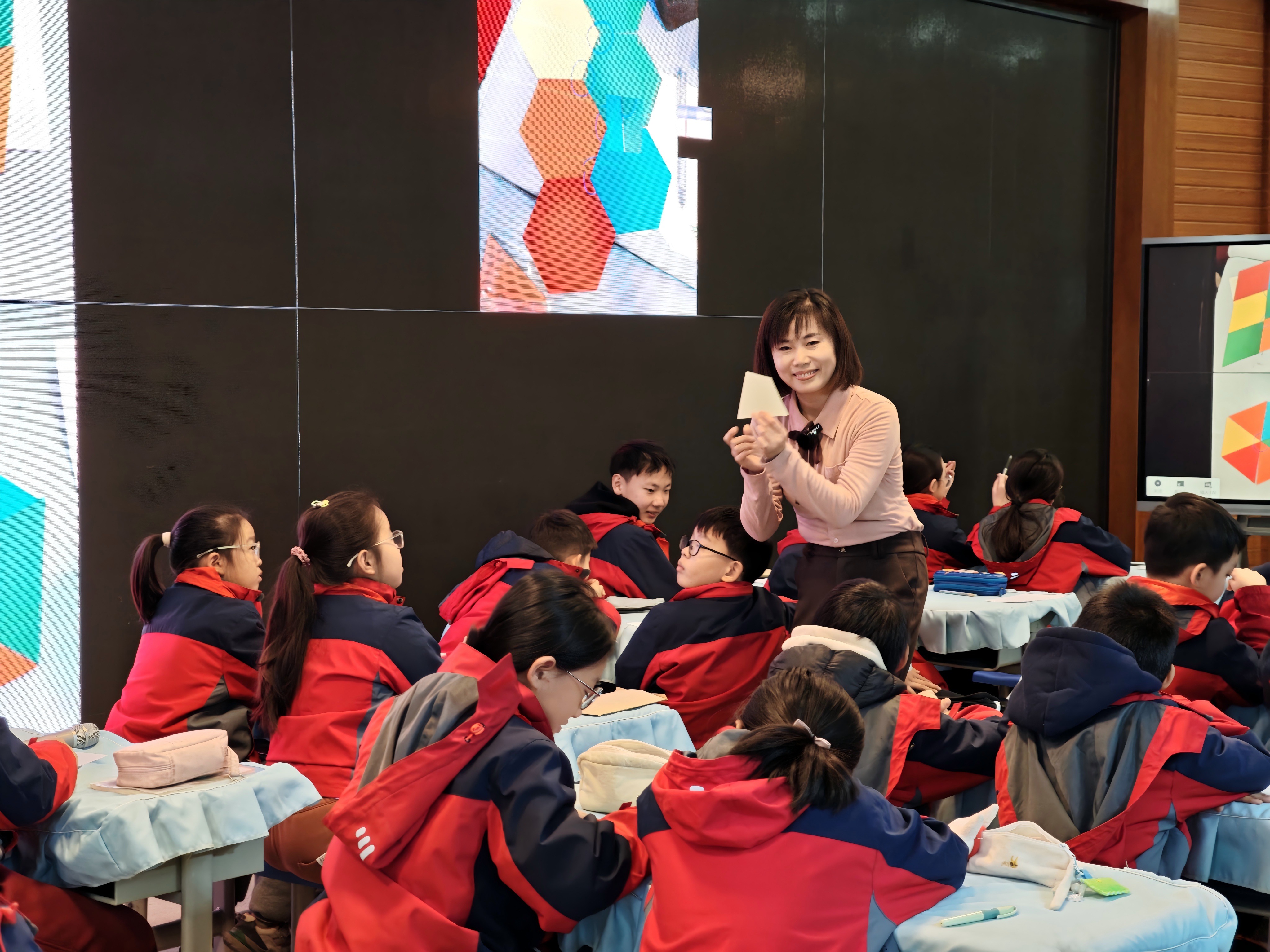 活动中,郑州市管城回族区创新街小学李媛老师带来的《有趣的密铺》一课,以目标为锚点设计学习活动和评价工具,实现“教中评、评促教”。李媛老师以“装修选地砖”这一生活场景为切入点,引出“密铺”的核心要素,让学生初步感知“无空隙、不重叠”的关键条件。整节课以“操作”为核心引擎,引领学生踏上了“猜想可密铺图形——动手拼摆验证——聚焦拼接顶点揭秘原理——运用规律创意设计”的完整认知阶梯。李媛老师凭借富有洞察力的层层追问,引导学生聚焦“拼接公共顶点”,自主提炼密铺的核心关键,实现从直观操作到理性思辨的跃升。课堂尾声的“小小设计师”活动,更是完美诠释了新课标倡导的“做中学、用中学、创中学”的学科实践新样态。