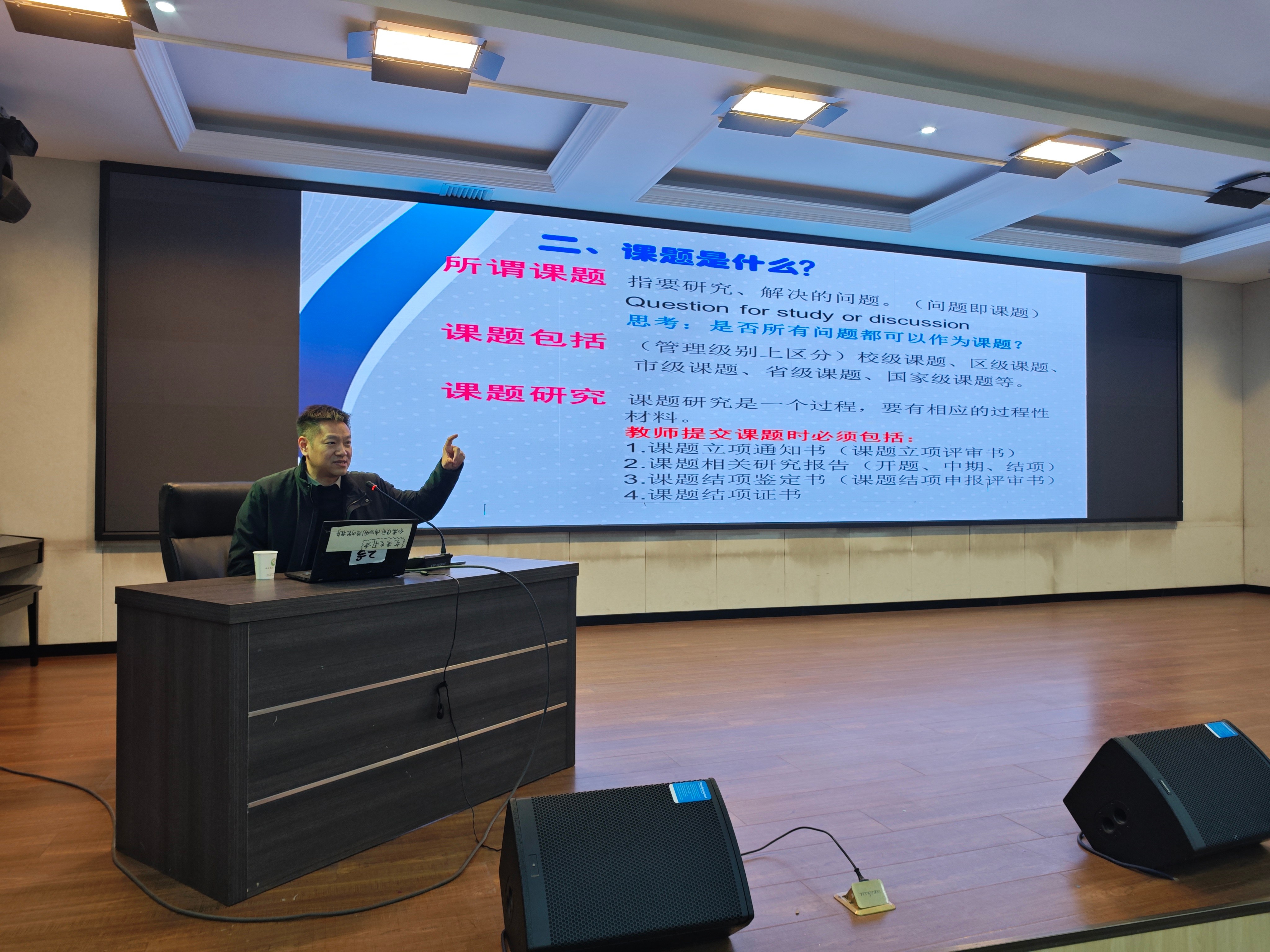 讲座中,王旸从“教师为何参与课题研究”入手,强调课题研究对教师专业发展的重要意义。他系统讲解了课题的定义、分类及层级,并结合职称评审要求,解析课题研究的方向。在选题与申报环节,重点阐述了科学性、价值性、可行性、创新性四项原则,指导教师立足教学实际,聚焦真问题。他还通过实例说明课题名称的规范设计方法,并详细指导申报书撰写要领,包括研究背景、目标、方法与计划等,分享常用研究方法的适用场景。