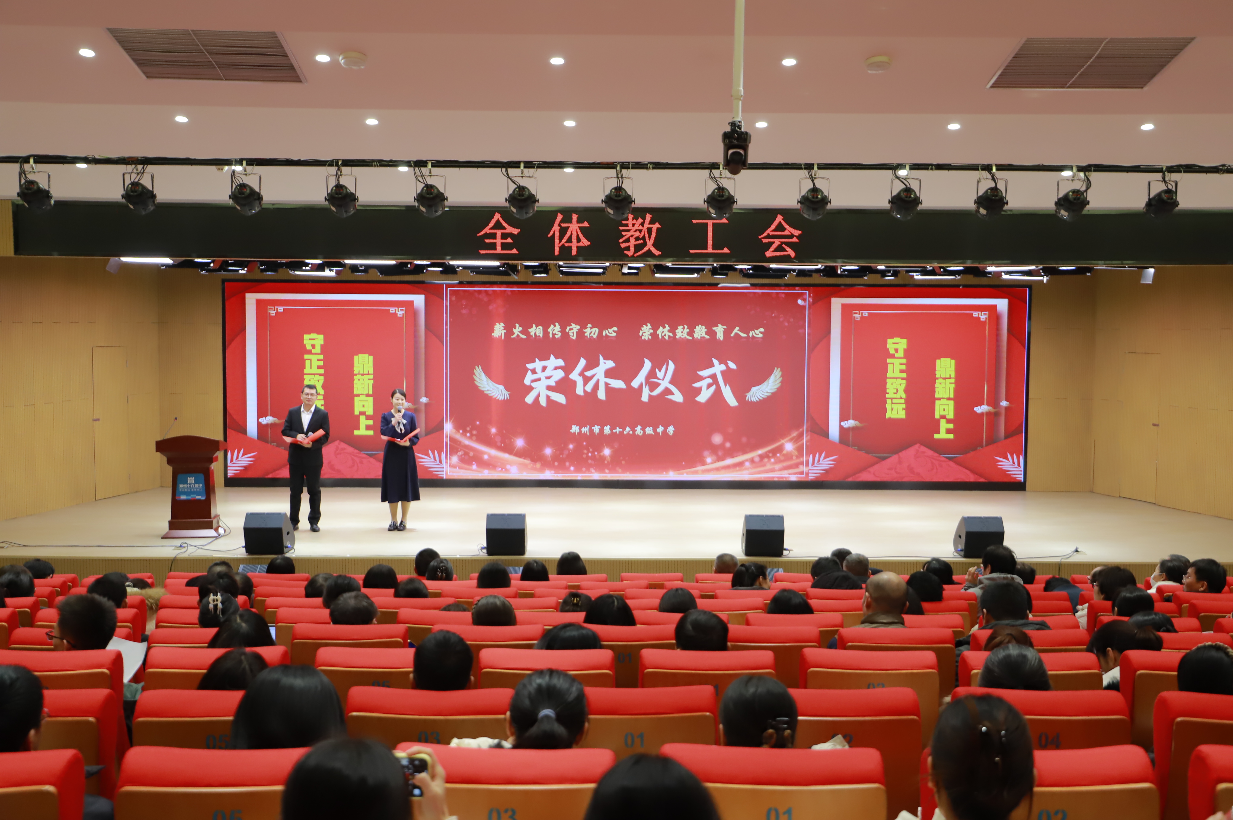 三尺讲台存日月,一支粉笔写春秋,一生耕耘,一生坚守。1月22日,郑州市第十六高级中学的会议室里气氛温馨而庄重,一场意义非凡的教师荣休仪式在此举行。孟祥辉、王红丽、刘世和、张鸿程四位在教育岗位上默默耕耘数十载的资深教师,迎来了他们职业生涯中光荣而温暖的时刻。学校领导班子成员、全体教师齐聚一堂,共同见证这一感人瞬间,向四位荣休教师表达崇高敬意与诚挚祝福。