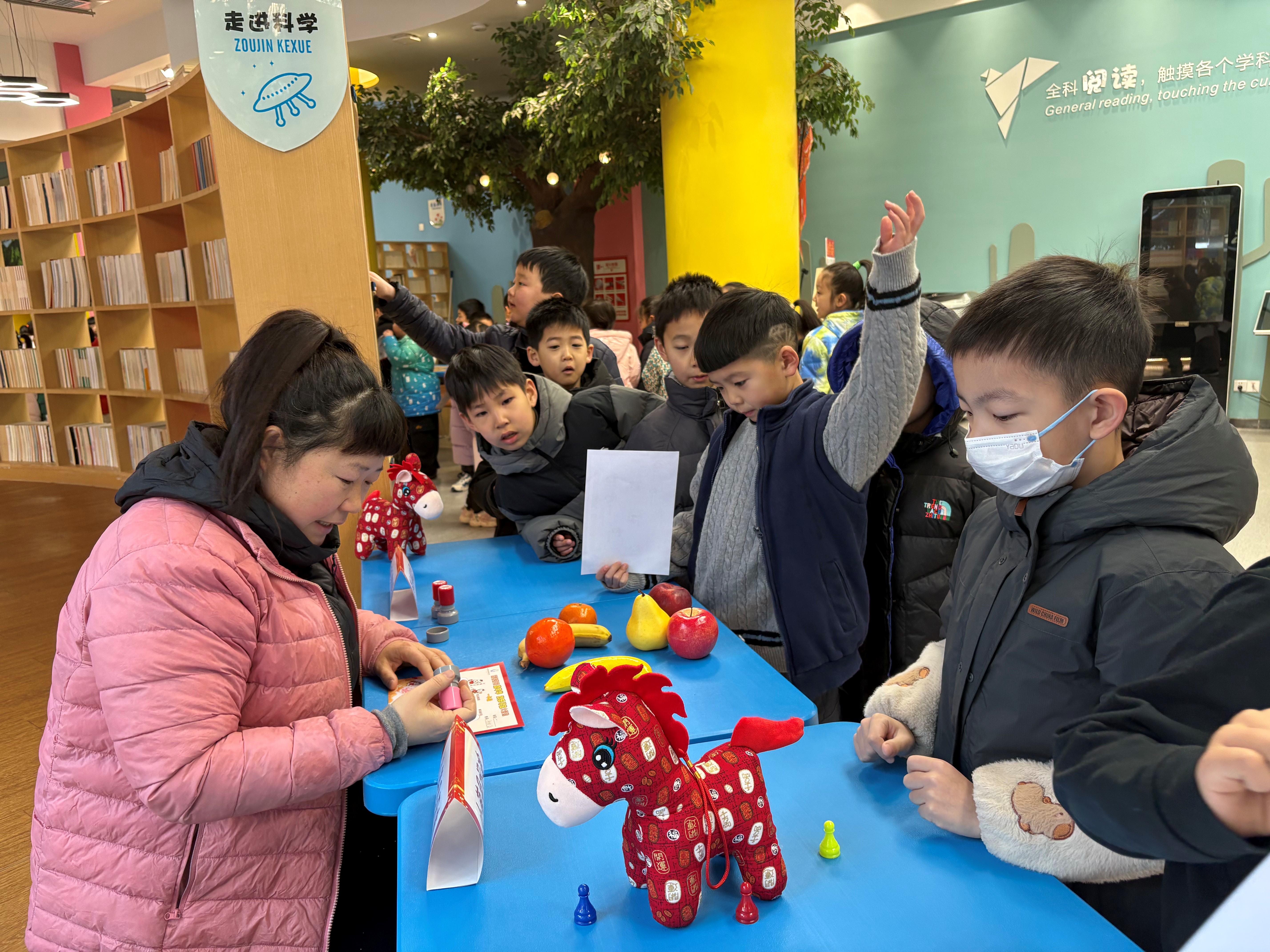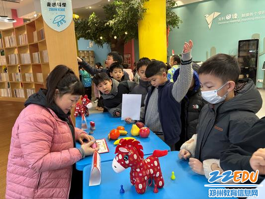 语文寻宝区墨香四溢,充满了文化气息。“骏马识字王”环节,学生们兴奋地抽取印有生字的“骏马福卡”,然后自信满满地准确朗读并组词,清脆的声音在空气中回荡。“萌马诵诗文”关卡,学生们声情并茂地背诵着一首首经典古诗文,那抑扬顿挫的语调、丰富的情感表达,仿佛将大家带入了古代的诗词世界。数学寻宝区则是一片充满挑战与欢乐的海洋。“福马报吉时”“萌马巧算术”“瑞马购好物”等关卡,将数学知识巧妙地融入生活场景,实现了数学生活化、游戏化的完美转变。科学闯关区宛如一个充满魔力的思维乐园,吸引着众多“小小科学家”前来探索。“萌马辨真假”“萌马画月亮”“萌马辨溶解”“‘力’马变变变”等关卡,使学生在亲身体验中享受科学探究的乐趣,激发了对科学的热爱之情。