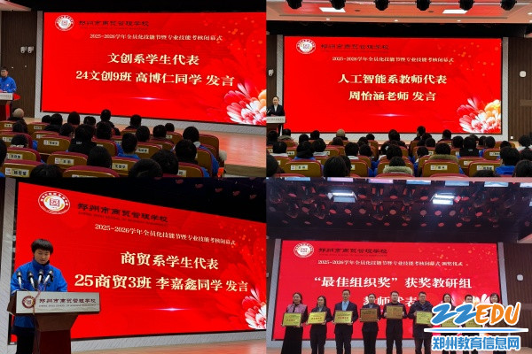 2026年1月22日,技能节在闭幕式暨表彰大会上画上圆满句号。大会全面回顾了技能节的精彩瞬间,对在活动中表现突出的优秀学生、优秀指导教师及“最佳组织奖”获奖集体进行表彰。郑州市商贸管理学校校长陈红霞在总结讲话中高度肯定了本届技能节所取得的成效:它不仅是一场成功的技能比武,更是一次生动的全员育人实践。活动有效提升了学生的实践能力和职业自信,强化了教师的教学改革动力,浓郁了校园的匠心文化氛围。郑州市商贸管理学校将以此次活动为新的起点,持续深化教育教学改革,优化技能人才培养路径,努力为区域经济社会发展培养更多高素质技术技能人才、能工巧匠、大国工匠。