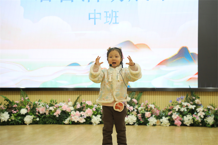 小班幼儿用奶声奶气的语调朗诵朗朗上口的儿歌,充满童趣的儿歌内容传递出满满的纯真与快乐。教师通过趣味引导,鼓励孩子们在集体面前勇敢表现,每一次举手、每一句清晰的朗诵,都是幼儿自信心的一次成长。中班幼儿通过讲述故事或送祝福,不仅提升了口语表达能力,也在传递美好祝愿的过程中,感受到传统文化的魅力与人际间的情感温暖。大班幼儿围绕幼小衔接开展自我介绍,落落大方地介绍自己并分享自己的兴趣爱好,认真专注的神情令人欣慰。在倾听与交流中,孩子们逐步提升了表达与交往能力,为步入小学奠定了扎实的语言基础。