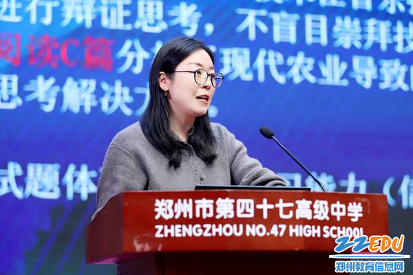 在试题分析报告环节,郑州市第十九高级中学付云凤老师从阅读与完形填空方面、河南省实验中学张怀俊老师从语法填空与写作方面对郑州市高三一测英语试题进行了分析。他们基于本次考试答题情况,探寻命题逻辑和答题难点、痛点,剖析失分原因,提出实用的教学建议,赢得与会教师的一致肯定。
