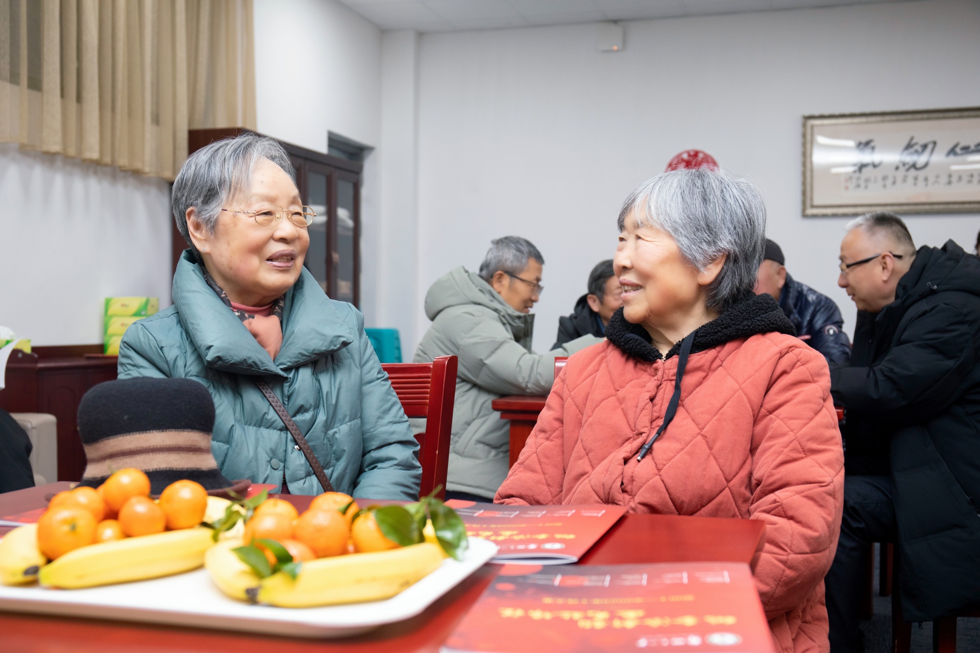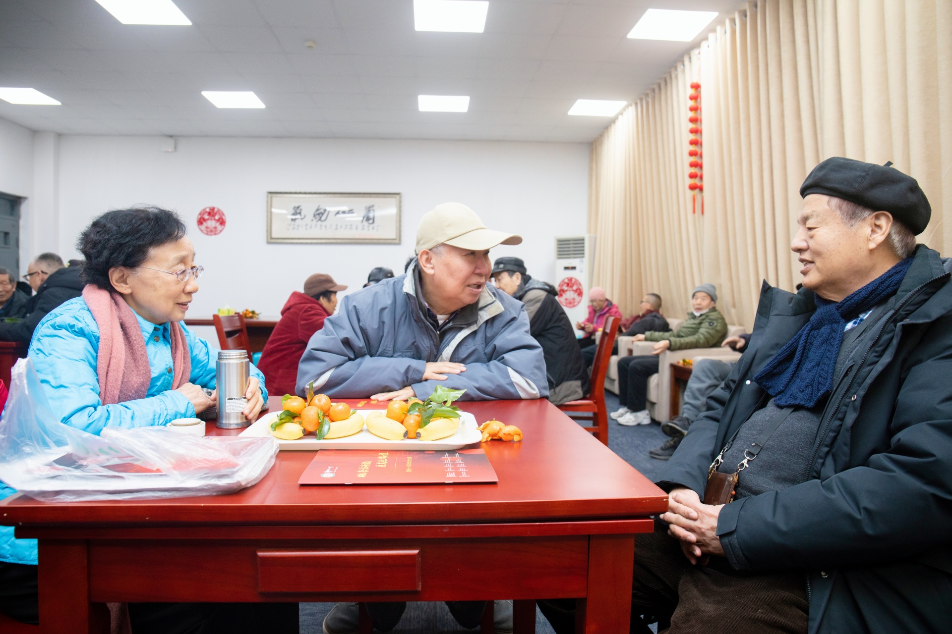 茶话会开始前,活动室内欢声笑语,年味浓厚。老同志们手中摩挲着洋溢喜庆的《2025年校园十件大事》,细细翻阅之际,眉宇间尽是欣喜振奋之色;鲜果盈盘、香茗袅袅,握手拥抱之中,退休老同志们皆感岁月温润、情谊绵长。