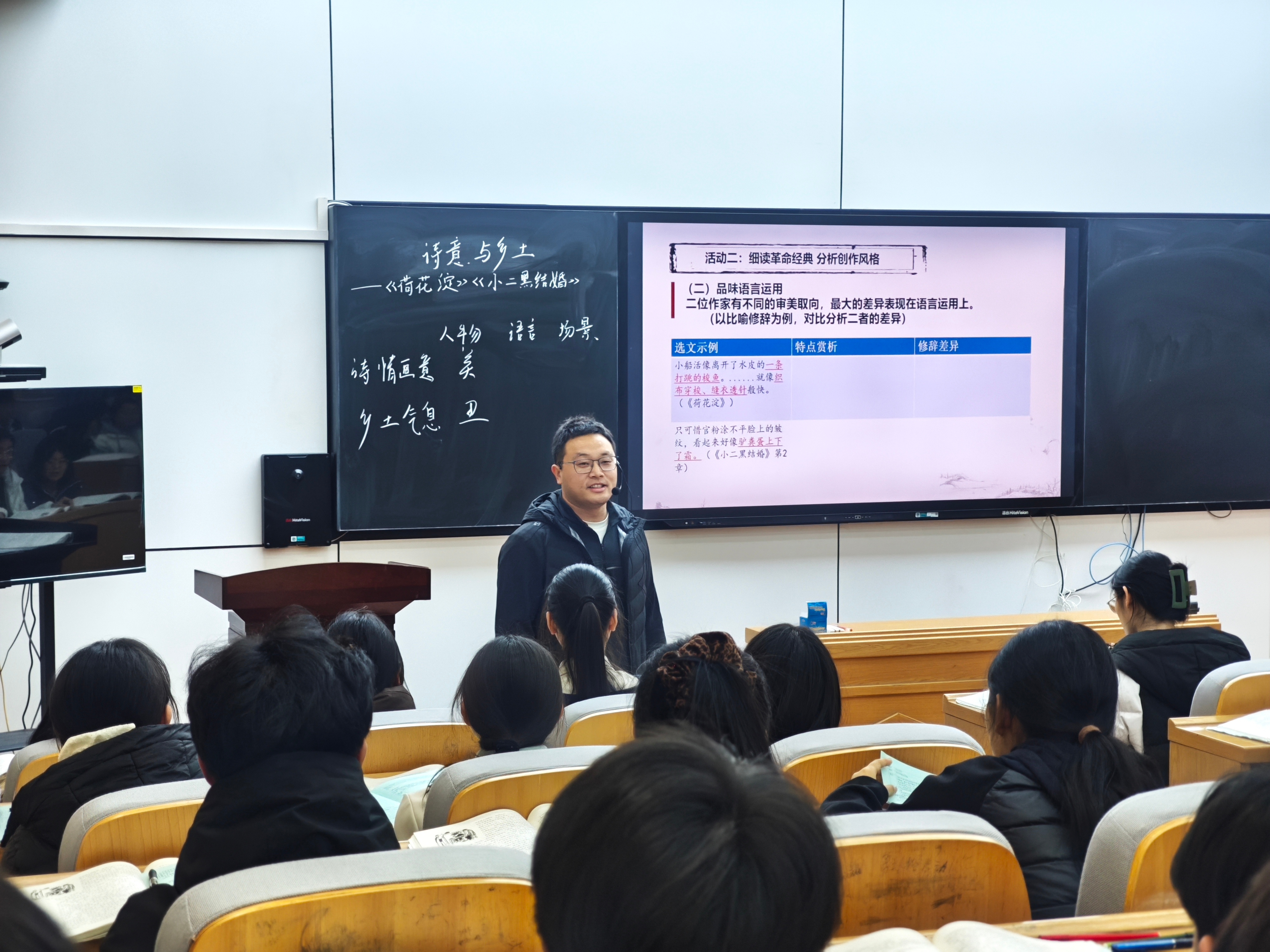 活动伊始,郑州龙湖一中郭磊磊老师执教观摩课《诗意与土味——〈荷花淀〉与〈小二黑结婚〉联读》,通过对比阅读引导学生深入理解革命文学的艺术特质与精神内涵。