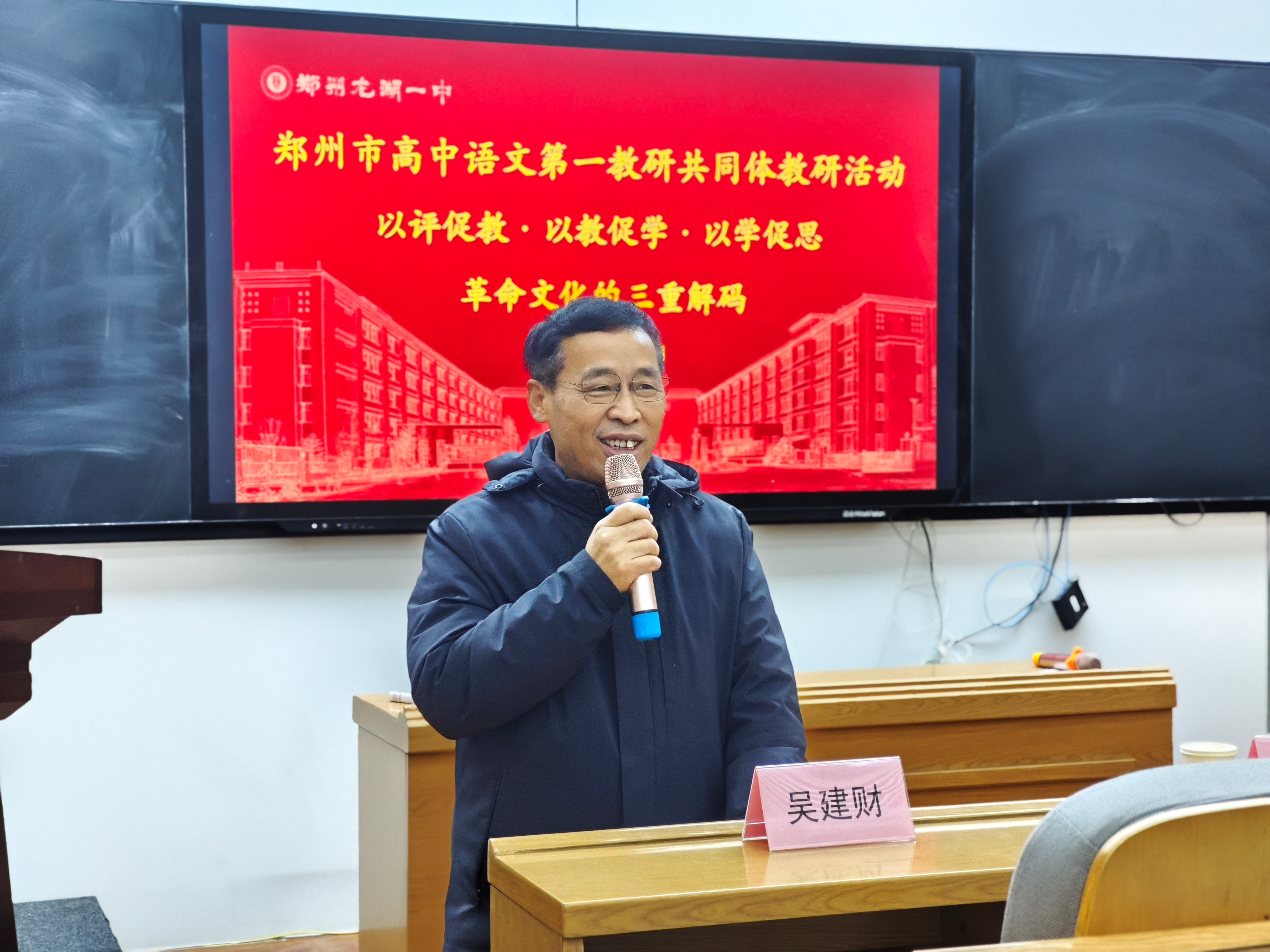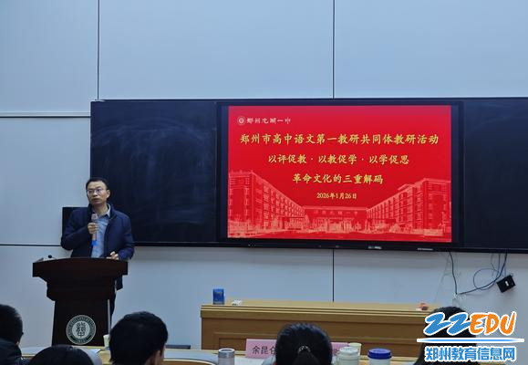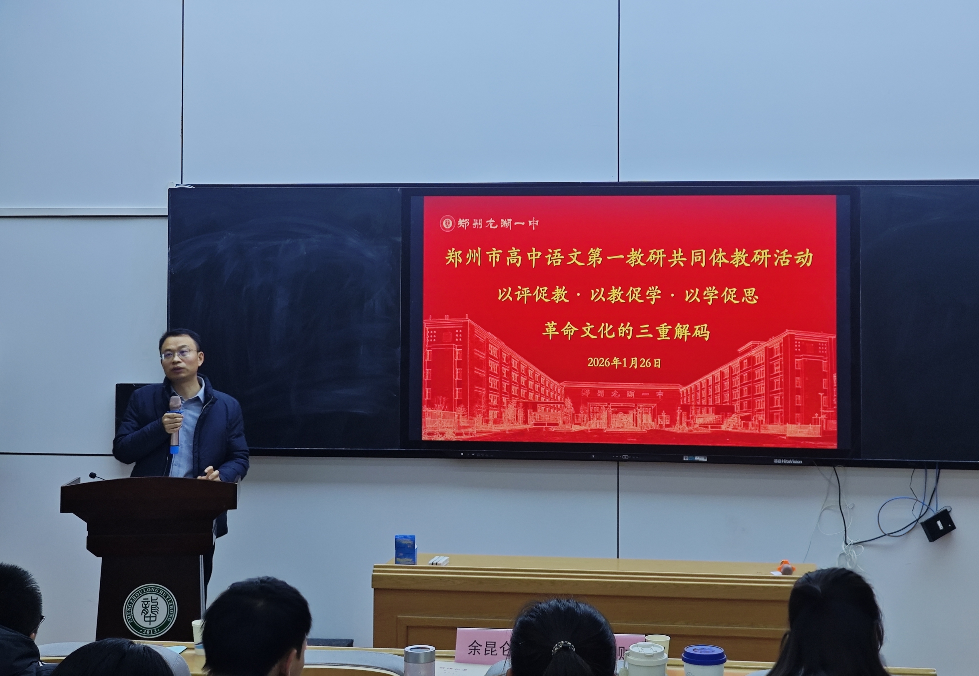 2026年1月26日下午,郑州市高中语文第一教研共同体主题教研活动在郑州龙湖一中举行。活动以“以评促教·以教促学·以学促思:革命文化的三重解码”为主题,旨在探索教学评一体化在教学中的实践路径。郑州市基础教育教学研究室语文教研员余昆仑、共同体各校语文教师及学校领导参加本次活动。