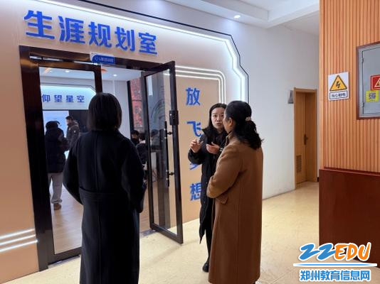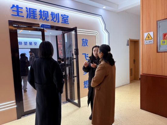 考察团一行实地参观学校生涯规划中心、法治教育中心、教育科研中心及社团活动室、教学生活区域。在各功能场馆内,考察团成员认真听取教师讲解,详细了解各中心的职能定位、日常开展的特色活动以及教学意义。作为省级优秀法治宣传教育基地,学校法治教育中心配备的现代化教学设备、编写的针对性校本课程,以及将普法教育与心理健康教育深度融合的创新做法,得到了考察团的高度关注。随后,考察团走进教学生活区,实地调研学校准军事化宿舍管理模式。从内务整理的统一规范,到作息时间的科学安排,再到独具特色的“学生成长银行”奖励机制,对学校精细化的管理举措给予高度认可。