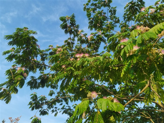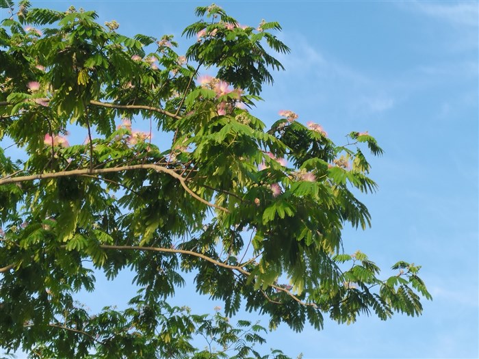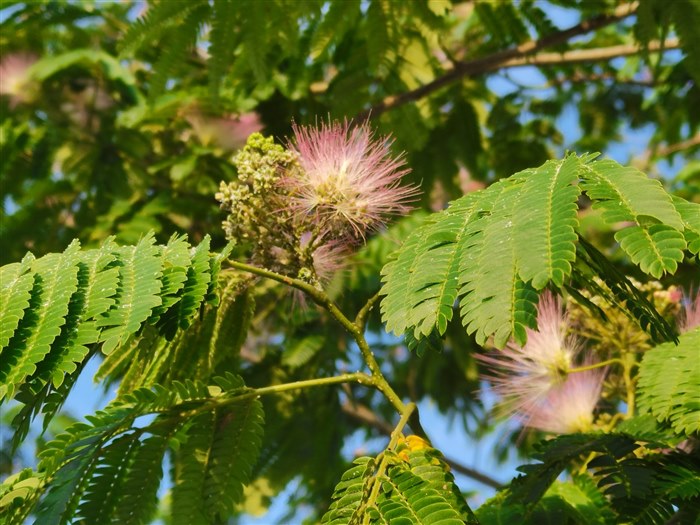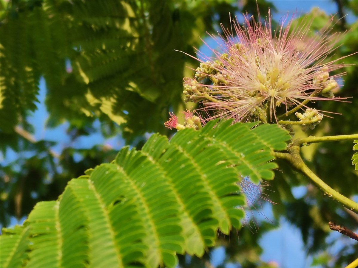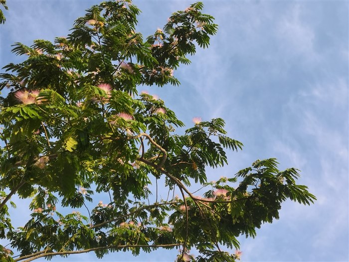 一抬头,合欢花儿开了,那如同仙女头上配戴的一把精致的绒扇,在湛蓝的天空下,在绿叶的映衬之间,显得分外美丽。