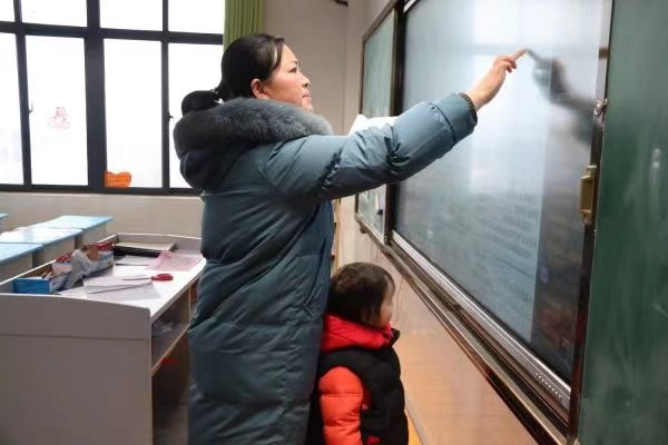外面是鹅毛大雪,空空荡荡的教室里,一名老师正在专心致志地对着多媒体给学生上网课,她的身旁,依偎着三岁半的女儿,乖巧懂事,静静得陪着妈妈......一时间,这张照片在朋友圈被频频转发,而照片背后的故事,更是让我们寿圣家人感动至深。不顾外面纷纷扬扬的大雪,不顾教室里冰冷的空气,更不顾身边年幼的孩子,就是为了追求教学效果坚守在教室里......这就是我们的陈红玉老师,一名敬业,爱生如子的寿圣之师,一位背负爱与责任的引路人!